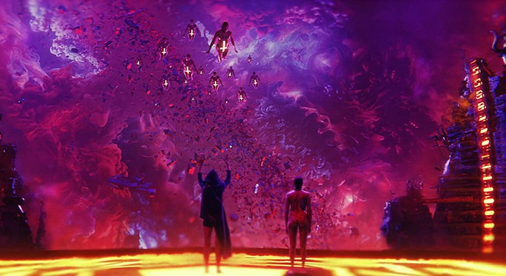 Blood Machines: Etant fan de synthwave et à plus forte raison de darksynth, ce moyen métrage était forcément un passage obligé pour moi. Mais aussi relativement casse gueule pour la team Ickerman vu son ambition de départ… Et pourtant… Véritable point fort du métrage, le visuel cyberpunk est spectaculaire sans être kitsch (à la croisée entre un Jodorowski et Metal Hurlant, si je dois me lancer dans des comparaisons hasardeuses), d’autant plus quand on comprend dans le making of qu’il est le résultat de divers effets/techniques et que les décors de base doivent beaucoup à l’ingéniosité des réal qui ont fait avec les moyens du bord! Question scénar, on reste dans la lignée de « Turbo Killer » (les vaisseaux remplaçant ici les voitures) avec des figures féminines mises en avant (j’ai vu que certains commentateurs parlaient de film féministe…ou à l’inverse de « beauferies » prétextes à reluquer des corps dénudés, ce n’est clairement pas mon ressenti), des archétypes typiquement bis (pour répondre justement à la polémique juste avant), de la violence, des vaisseaux qui passent le mur du son, du surnaturel, des lumières fluo dans le pur cliché rétrowave, un brin de symbolisme,… Le film a d’ailleurs été annoncé comme un « cosmic opera ». Tout à fait le genre d’univers auquel on peut s’attendre quand on connaît un peu Carpenter Brut, au final. Ca reste parfois flou, mais honnêtement, je ne trouve pas ça si gênant. Blood Machines est à mon sens plus une expérience sensorielle qu’un pur récit délivrant un message social ou politique (même si, à mon sens, Blood Machines en délivre un, plus subtil). Personnellement, j’en ai un peu ma claque de lire systématiquement des réactions de pisse-froids hystériques…pour une fois que des réal essayent d’expérimenter hors du champ politique et pas de se plier au « cahier des charges » (trop souvent) politiquement correct pour faire plaisir aux crétins du dessus et autres communautés toxiques (qui n’ont visiblement pas bien compris l’intérêt subversif du cinéma de genre ni la finalité liberticide du jeu auquel ils s’adonnent)… Si la crainte de voir un « long » clip de Carpenter Brut pointe le nez au début, qui ne servirait qu’une musique, elle s’efface très vite. Et à vrai dire, j’ai été assez peu attentif à la BO de Carpenter Brut tout au long de ses 50 minutes, tant le reste du film est accrocheur… Qu’on se comprenne bien, dans ma bouche, ça veut dire qu’elle colle parfaitement avec son sujet! Pour ma part totalement inconnus, je trouve que les acteurs s’en sortent plutôt bien…j’ai découvert d’ailleurs à l’occasion de cet article que la plupart avait déjà une petite expérience dans le domaine…