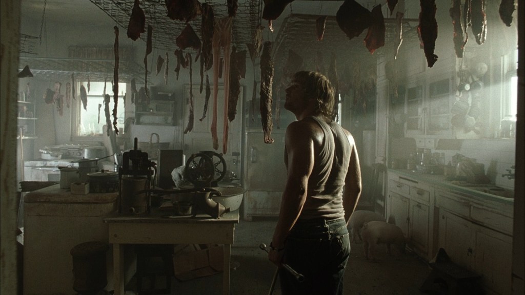Massacre à la tronçonneuse (remake/reboot): Remake que je voulais voir depuis longtemps au vu de sa réputation et qui se laisse agréablement regarder, ce cinquième opus de la saga maudite (une de plus!) prend évidemment des libertés avec le modèle originel tout en conservant son côté glauque et poisseux qui faisait tout son sel (même si on est ici dans une frontalité assez assumée façon Aja avec La Colline a des yeux). On évite donc une repompe génante et inutile de la scène du repas (exemple pris au hasard) puisque Marcus Nispel semble avoir compris l’essence même de TCM et prend bien son temps pour installer ses personnages, ses ambiances et surtout son visuel. Cela fait vraiment plaisir, tellement cet amour du détail et du travail bien fait sans tomber dans le fan service reste bien rare dans le cinéma de genre actuel! Leatherface (campé ici par Andrew Bryniarski, qu’on retrouvera dans l’opus suivant trois ans plus tard, préquelle du film ici chroniqué) est très réussi, les acteurs s’en sortent globalement bien et on retrouve avec plaisir quelques tronches plus ou moins connues: Biel, Leerhsen, Lee Ermey, Tucker, Vogel,… On se fera donc le remake de Vendredi 13 du même monsieur avec un certain intérêt maintenant (de toute façon il ne peut pas être plus nullissime que l’original)!